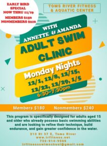 Looking to sharpen your swimming technique, build endurance, or feel more confident in the water? Toms River Fitness & Aquatic Center is offering a fantastic opportunity this winter with their Adult Swim Clinic, led by coaches Annette & Amanda.